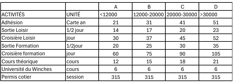 La nouvelle grille tarifaire proposée ci-dessous confirme la volonté du Winches Club de maintenir des activités accessibles à tous et pour cela de travailler sur l’équité d’accès à des tarifs différenciés.